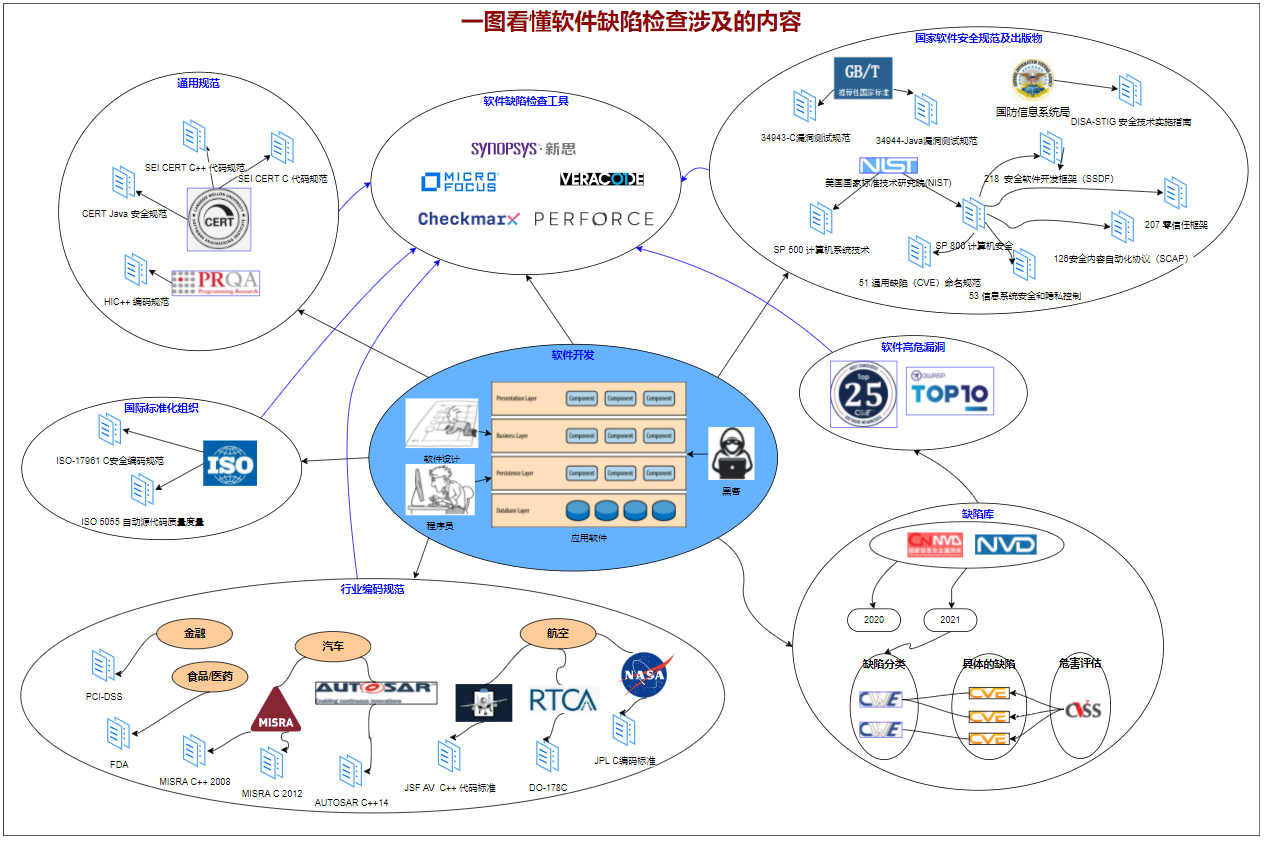 - 这个图更多的是从如何减少软件缺陷出发,展示了业界发布的各种编码规范中的一部分,这些规范都是静态检查工具在检查的过程中需要完成覆盖的;