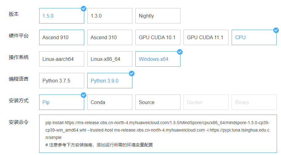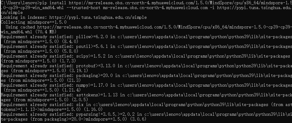 pip install https://ms-release.obs.cn-north-4.myhuaweicloud.com/1.5.0/MindSpore/cpu/x86_64/mindspore-1.5.0-cp39-cp39-win_amd64.whl --trusted-host ms-release.obs.cn-north-4.myhuaweicloud.com -i https://pypi.tuna.tsinghua.edu.cn/simple