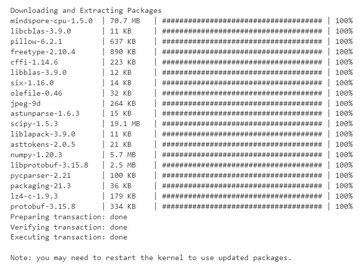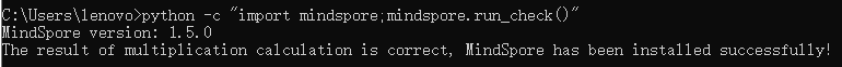 显示安装成功,并且输出MindSpore版本号1.5.0