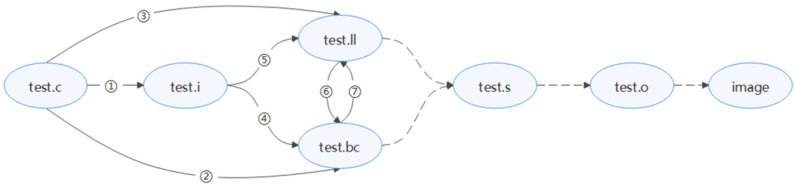 上面列出了一部分Clang不同文件直接转换的命令(和第 1 部分的 示意图 序号匹配,还是只关心前端部分)。只是最后增加了一个将多个 bc 合并为一个 bc file 的命令。