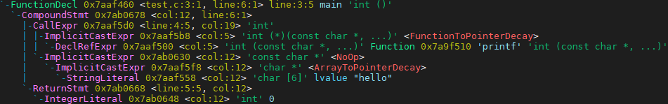 头上的头文件引用等已经展开,没有了,但是下面的 main 函数定义,则如上面的 FunctionDecl 所示,并且给出了 代码中的位置。这里就不详细分析AST的结构了,写几个例子比对一下就很容易理解。