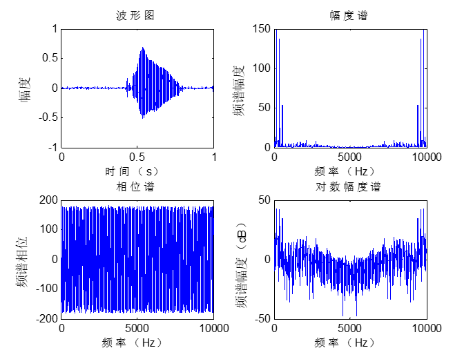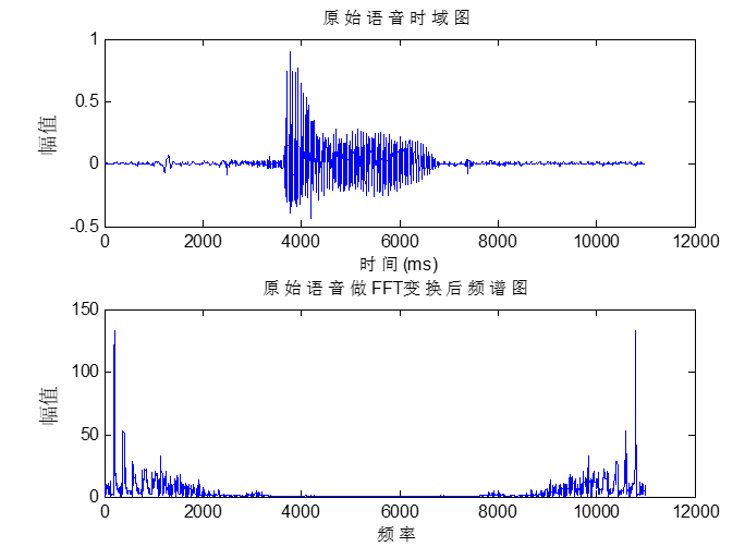 在MATLAB平台下,对语音号进行快速傅里叶变换,得到信号的幅频特性、对数幅度谱。要求与语音信号的时域波形图画在一个窗口。
