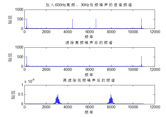 分析:从播放滤波前和滤波后的声音效果来看,滤波后的语音信号听起来更加柔和。猜测是通过一个低通滤波器,滤除了高频杂音和降低了语音本身的能量。同时看到低频噪声和高频噪声均被滤除。同时原始语音信号本身也被衰减了,但是不影响听起来的效果。