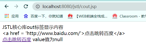 <c:out value="<a href = 'http://www.baidu.com/'>点击跳转百度</a>"></c:out>