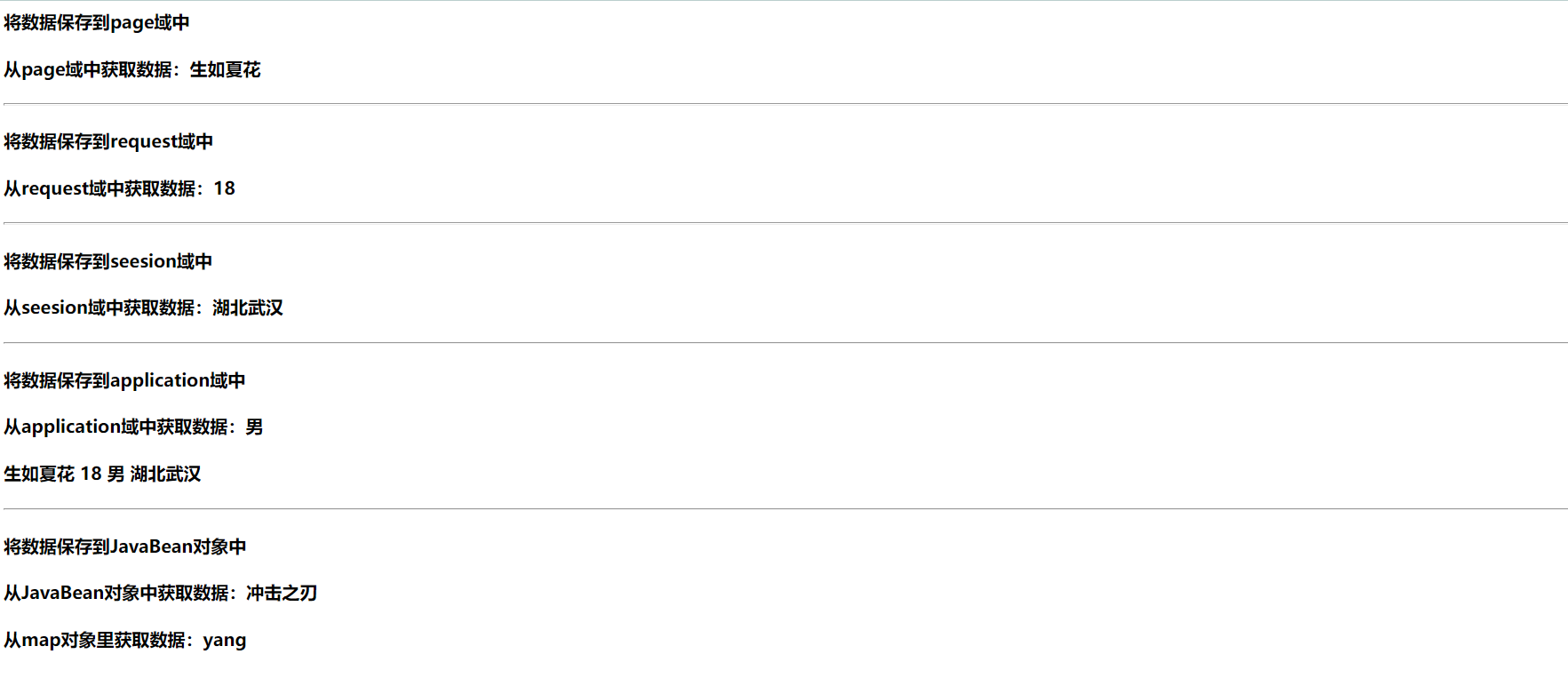 这里我示例了四个范围:page,request,seesion,application和javabean、map,通过c:set保存值,然后通过el表达式取值