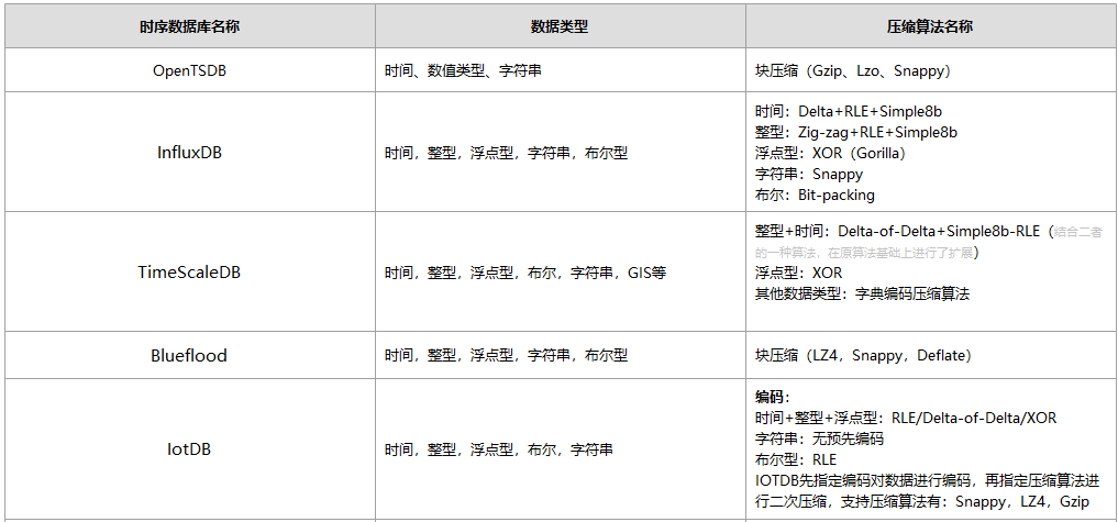 下表列举了一些常见的开源时序数据库和对应采用的数据压缩算法。