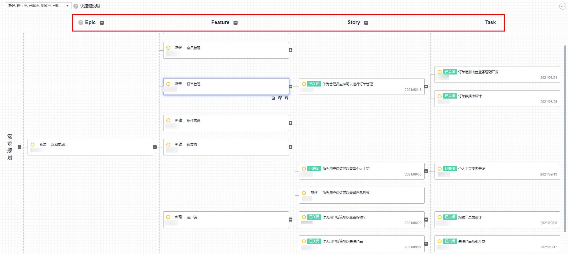敏捷使用迭代的方式进行需求规划,在初期会通过用户故事地图、MVP等方式对产品的主干功能进行规划,相当于构建了产品的骨架,在每个迭代基于当前要做的需求,进行细化拆分,比如下图(以华为云DevCloud “规划”功能为例),先通过思维导图的形式将产品的各项功能脉络梳理出来,每个模块具体细节功能在需要开发的时候进行拆分即可。