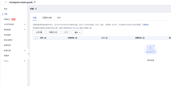 创建完之后,将数据集和源代码上传至OBS的桶中,在OBS界面点击创建的桶。