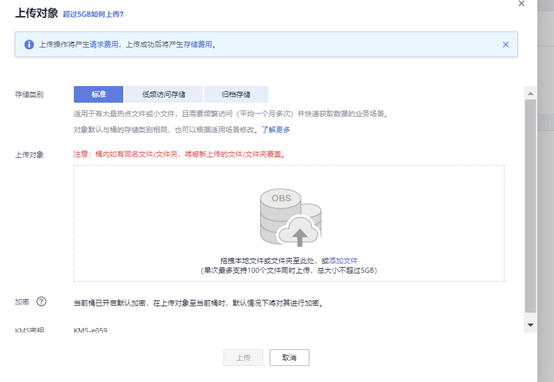 可以直接拖拽本地文件至对应处上传,上传文件有数量大小限制,如何无限制上传,可以借助其他工具,可以考虑obsutil