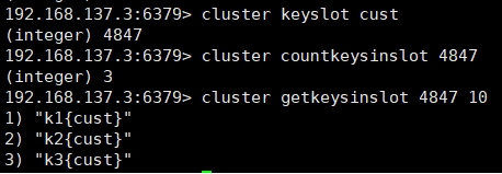CLUSTER GETKEYSINSLOT <slot><count> 返回 count 个 slot 槽中的键
