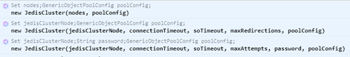 //JedisCluster j = new JedisCluster(jedisClusterNode, connectionTimeout, soTimeout, maxAttempts, password, poolConfig);