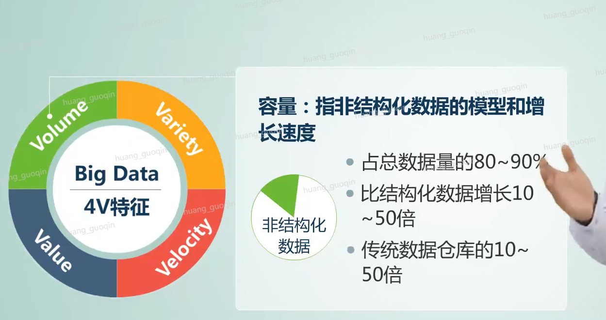 主要指非结构化数据的规模和增长速度。因为非结构化数据占数据总量的百分之八十到百分之九十,同时呢也比结构化数据增长快十倍到五十倍,并且数据量是传统数据库的。十倍到五十倍。