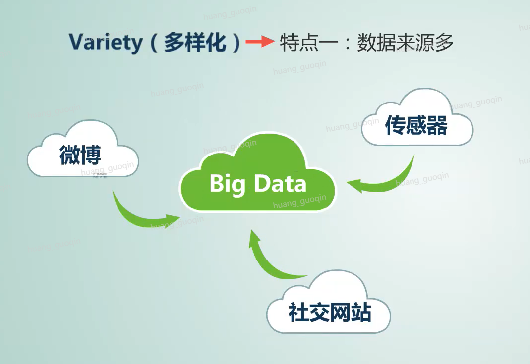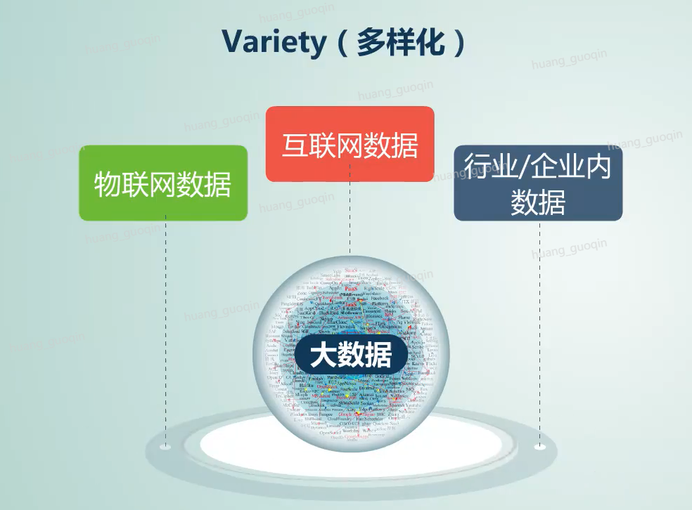 第二个,variety(多样化)。其实物联网数据、互联网数据、企业、行业内的数据呢都是大数据的数据组成部分。那么大数据的多样性主要体现在: