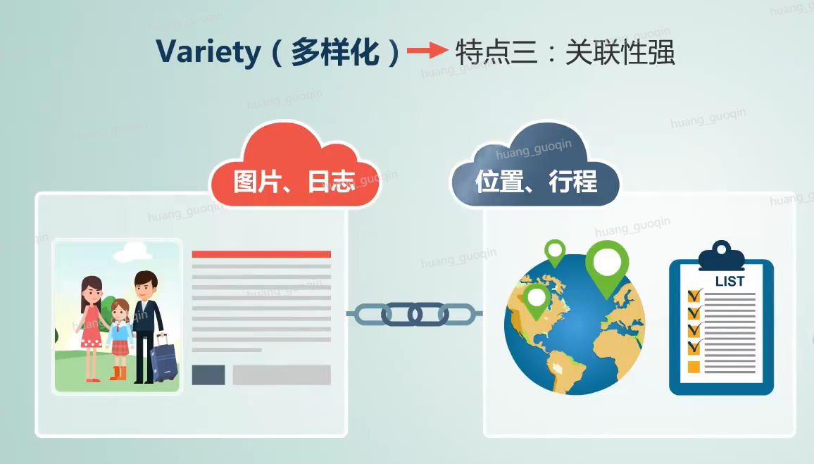 第三、关联性强,数据之间的频繁交互。比如游客在旅途中上传的图片和日志,其实呢与游客的位置和行程等信息呢有很强的关联性,因此大数据不仅体现在量的巨大,还体现在种类的丰富多样。