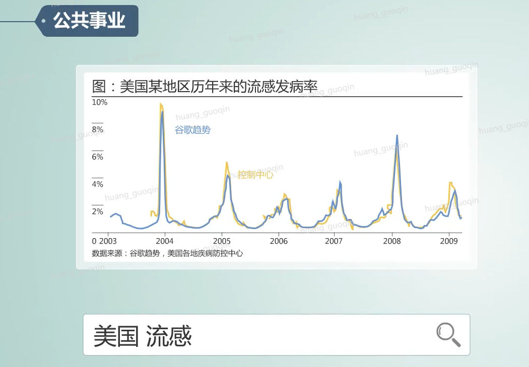 在公共事业方面,谷歌的流感趋势图通过跟踪搜索词相关数据来判断全美地区的流感情况,政府和医疗机构可以根据相应的分析情况做出相应的对策,以预防流感蔓延。这是大数据在公共事业方面的应用。