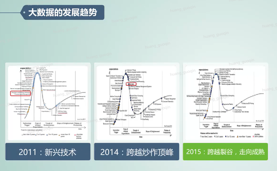 如今百分之五十的企业已经投资和使用大数据,而百分之三十三的企业正在规划如何利用大数据。我们看到在大数据领域的持续投资也促使了大数据逐渐的步入到了成熟、发展阶段。而在二零一五年的新技术图中,我们已经找不到了大数据的身影,代表着大数据不再是新兴技术,而已经成为了一种主流技术。