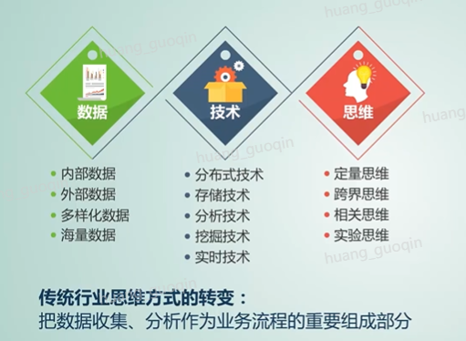 华为眼中的大数据是数据,包括了内部数据、外部数据、多样化数据、海量数据。技术,包括了分布式技术、存储技术、分析技术、挖掘技术和实时技术,更是一种思维,包括了定量思维、跨界思维、相关思维和实验思维。除此之外,大数据还需要传统行业思维方式的转变,要把数据采集、分析作为业务流程的重要组成部分,数据驱动业务流程优化,实现智能化和自动化,并依托数据资产实现跨界拓展。