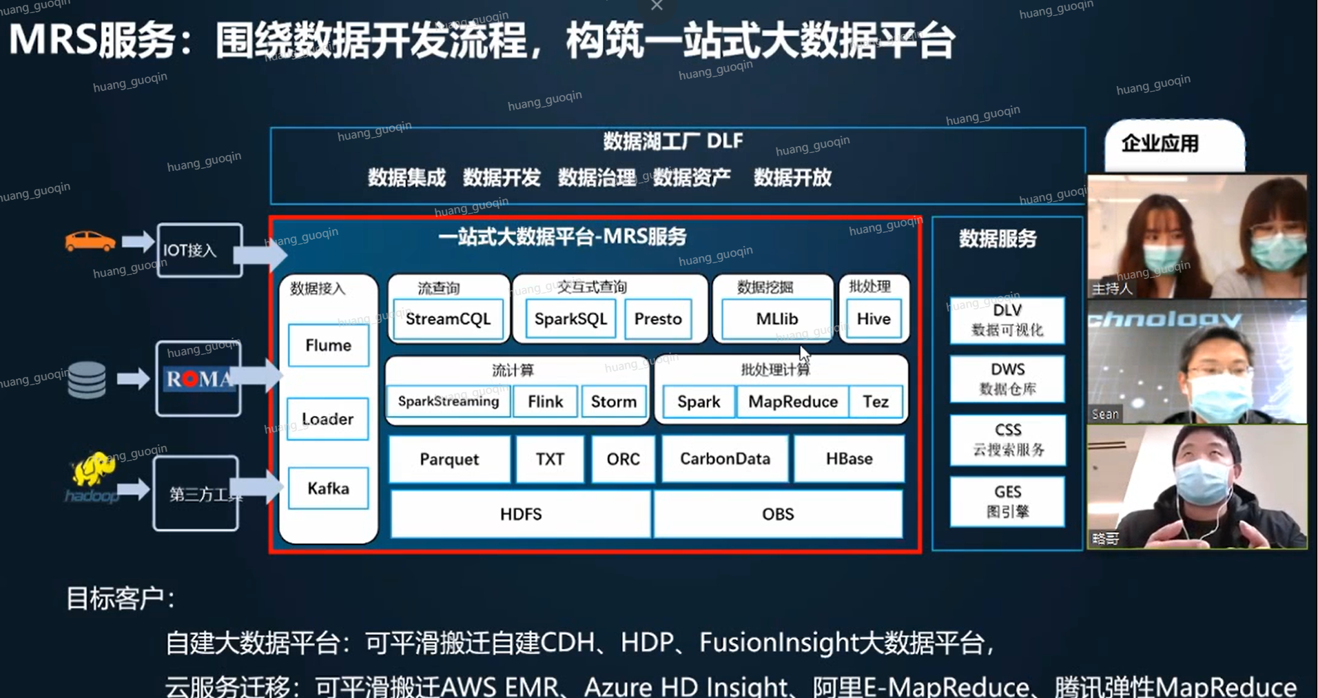 在生态方面,我们的大数据平台是百分之百跟开源接口进行兼容的,开源生态里面能够接入的那些工具、软件或者服务,在我们的华云平台的大数据服务上面都可以都可以继承过来或者都可以接入过来,方便用户能够比较方便或者比较灵活的把我们的大数据平台迁移到华为云上面来。这是我们自己梳理了一下,我们的大数据平台或者我们的MRS服务比较适用的这些场景。但现在我们看到这个一站式的大数据平台,它只要满足一个条件就基本上比较实用,就是我们做的只要能够产生大量的数据,而且这个数据可能占TB级别或者更大的这个重量维度来来看的话,超过了TB,几十TB、上百TB或者TB级别的话,那么他们一般来说这些行业不得不使用这种大数据平台来对我们的数据进行一些清晰转换的话,能够出一些汇总统计。同时还有一部分用户可能会将来做一些类似用户画像、精准营销等等这方面的操作,来为我们的业务产生更多的价值。数据能够通过大数据平台产生价值,为上层的业务服务。