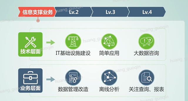 第一个阶段是信息支撑业务,在技术层面支持,从大数据的it基础设施建设、简单应用以及大数据咨询等。而在业务层面,以降低成本为目的的数据管理、改造、离线分析、关注查询和报表。
