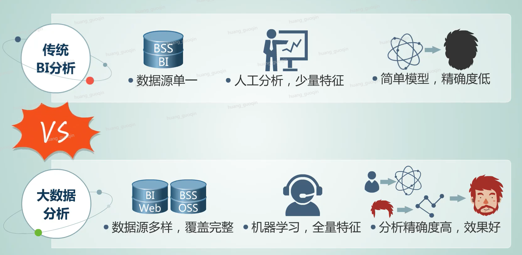传统的BI分析数据源单一,主要来自于BI系统和BSS。即业务的支撑系统,分析过程主要靠人工分析,特征不明显。除此之外,分析模型简单、精确度低。而我们的大数据分析数据来源多样、覆盖完整,数据来源包括了BI系统、Web、BSS、OSS,也就是运营、支撑系统等分析过程通过机器学习实现对所有数据进行全量分析,并且分析精度高、效果好。