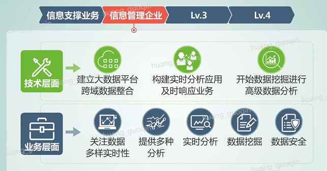 第二阶段是信息管理企业技术层面,建立大数据平台、跨域数据的整合以及分析构建、实时分析应用、及时响应业务,并且开始数据挖掘,进行高级的数据分析。而在业务层面,关注数据的多样化、实时性,提供多种分析、实时分析、数据挖掘和数据安全等。处于该阶段的企业有金融、企业、政府机构等。
