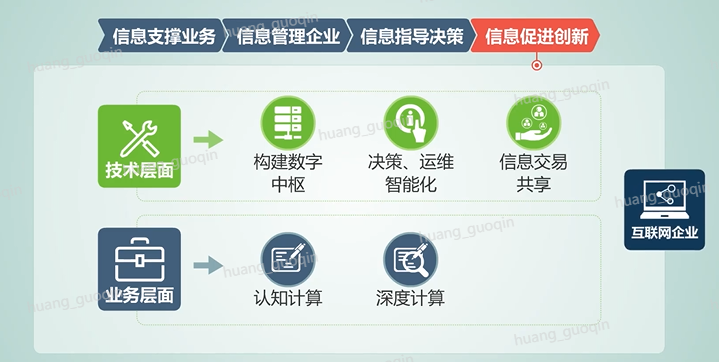 第四阶段是信息促进创新。技术层面构建企业的数字中枢、决策和运维的智能化、信息交易和共享。业务层面主要包括了认知计算、深度计算等。那么处于该阶段的企业主要是互联网公司。