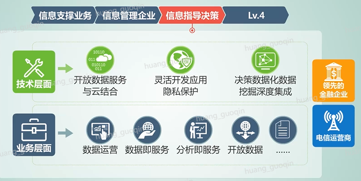 第三阶段是信息指导、决策。技术层面,对外数据开放,提供数据服务、大数据和云相结合。支持、灵活开发各种应用以及隐私保护。企业决策数据化,跨行业、跨领域的数据挖掘、深度集成。业务层面包括数据、运营、数据集、服务、分析及服务开放数据等。处于该阶段的企业有领先的金融和电信运营商。