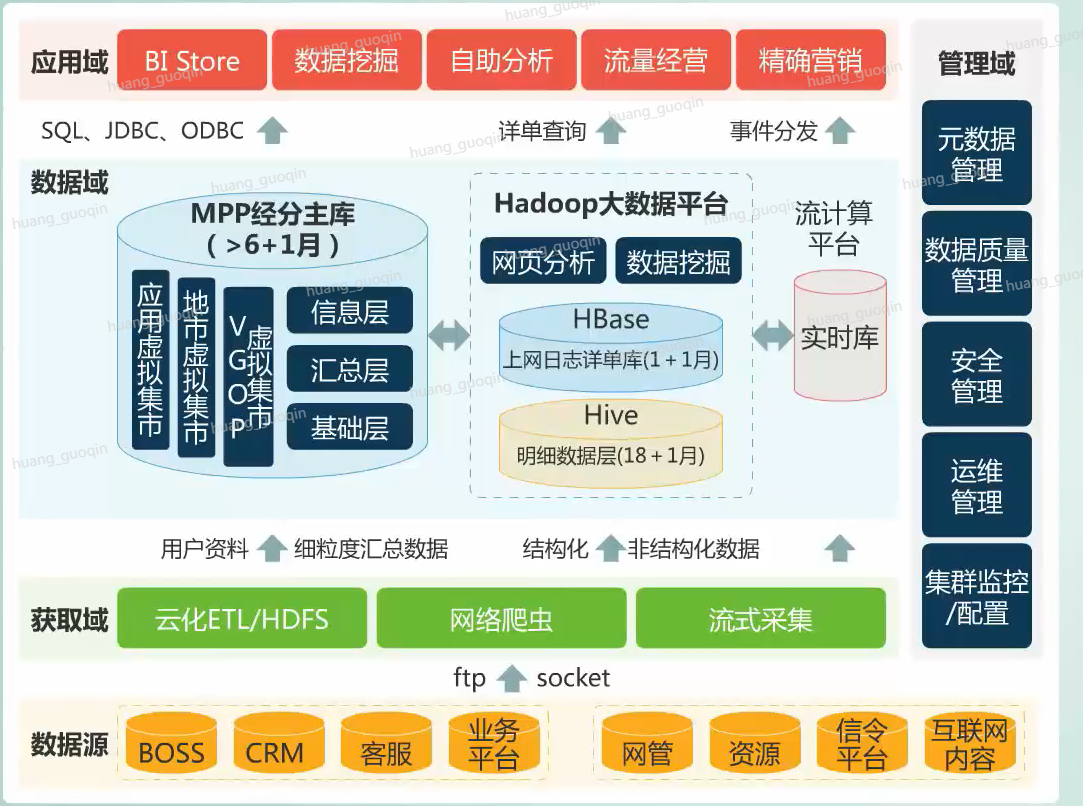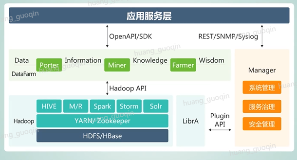 上图就是华为大数据平台的整体架构图,它包含了三层,其中还有五层提供了大数据的处理环境,是基于社区版开源软件hadoop做的增强和优化。在这里面我们称为是Fusionlnsight hd平台。DataFarm层提供了支撑端到端的数据洞察、构建数据到信息、到知识、再到智慧的数据供应链,包含了数据集成服务Porter、数据挖掘、服务Miner和数据服务框架Farmer,而manager是一个分布式的系统管理框架。管理员可以从单一的接入点操控分布式集群,可以实现系统管理、数据安全管理和数据治理等。