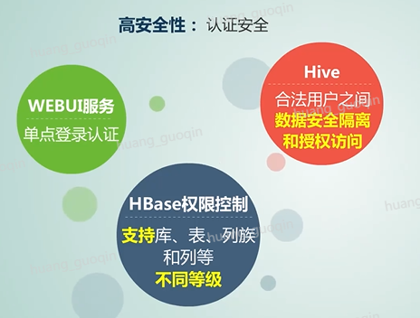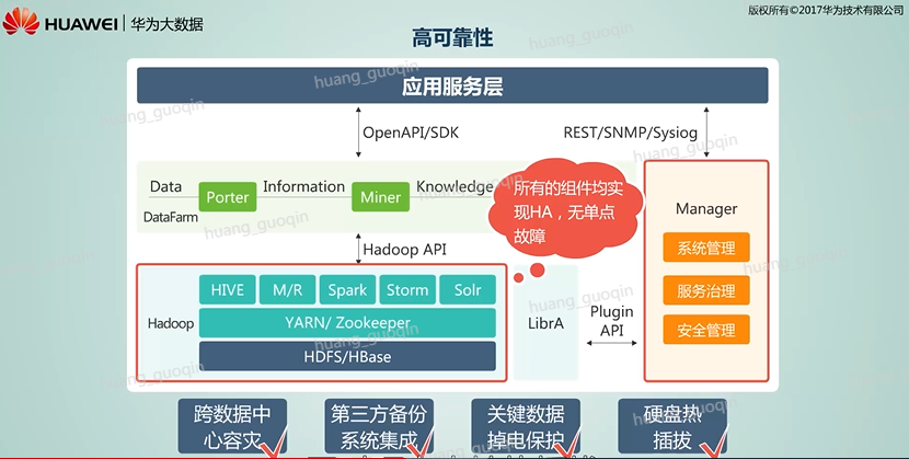 那么既然Fusionlnsight的平台是基于开源软件开发的企业级增强平台,它的增强特性主要体现在高可靠、高安全、高性能以及解决方案配套能力四个方面。那么接下来我们将针对这四个方面做一个详细的了解。大数据平台的高可靠性体现在Fusionlnsight HD所有的管理节点组件均实现高可用,所有的组件无单点故障,其中HBase集群能实现一千公里以上的异地灾备、表集集群备份、全量、增量日志备份,支持关键数据掉电保护,同时硬盘支持热插拔。