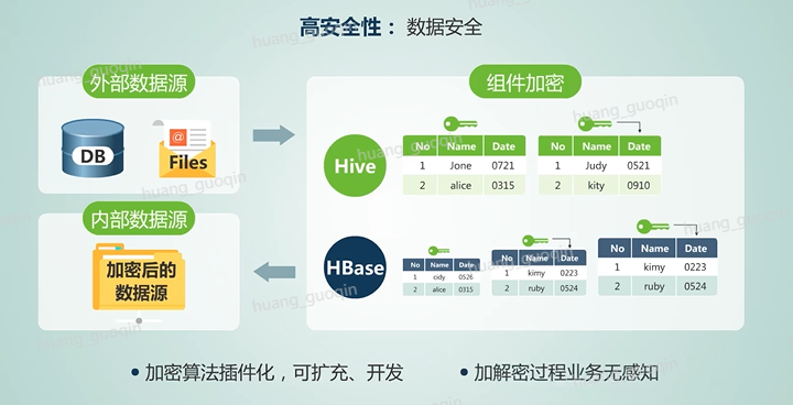 同时Fusionlnsight 还可以对文件系统进行加密,Hive、HBase可以对表、字段进行加密,集群内部用户信息禁止明文存储。加密算法插件化,可进行扩充,也可以自行开发,并且加解密的过程业务完全无感知。