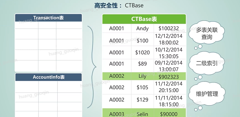 而高性能主要体现在针对数据密集型行业、传统数据库、数据仓库的大量关联表的设计,创新地实现了CTBase方案,可以将多个具有类似功能或者是存在关联的业务表聚簇到一个HBase大表中,从而提升一些关键场景的多表关联查询的性能。另外CTBase还提供了二级索引、RowKey Schema的维护管理等关键能力。