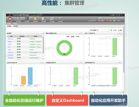 Fusionlnsight平台在集群管理方面,Fusionlnsight manager作为Fusionlnsight的运行维护中心,支持系统的双击和分布式并行处理,可以在十分钟之内完成集群安装,支持全自动化在线运行维护、自定义Dashboard、自动化的应用开发助手,让企业可以轻松地管理大数据系统,提供向导式升级、回退的界面操作,当升级过程异常时,支持自动安全回退,也支持观察期手工触发安全回退,可以在六分钟内完成Hadoop的集群升级。