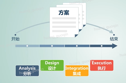 华为提供了即大数据平台、行业、业务、模型分析以及咨询服务为一体的大数据商业咨询服务总体方案。这样的总体方案从拟定到落地执行需要经历Analysis分析、Design设计、integration集成、Execution执行四个阶段,其中分析主要包括市场分析、行业趋势分析、竞争分析、业界实践分析,然后根据分析结果来界定问题、构建问题数、确定根由进而梳理出需求和机会点。
