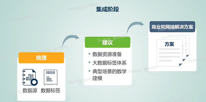 集成阶段包含了对支撑数据源的梳理、现有标签梳理,从而给出数据资源准备建议、大数据的标签体系建议以及典型场景的数学建模建议,最终形成商业和网络的解决方案。