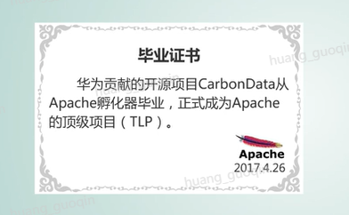 二零一七年四月二十六日,Apache软件基金会宣布,华为贡献给Apache社区的开源项目CarbonData从Apache的孵化器毕业,正式成为Apache的顶级项目(TLP)。这意味着华为已经从大数据开源社区的参与者,转变成为社区和生态的引领者之一。