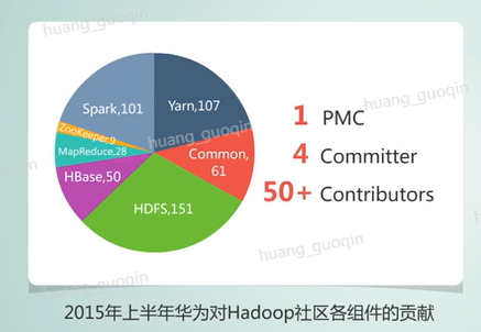 而华为对开源社区的贡献也非常可观,比如华为对Hadoop、spark等产品的贡献。已经稳居第一阵营,并且对开源社区的整体贡献呈逐年递增趋势。那么下图是二零一五年上半年,华为对Hadoop社区各组件贡献的分布情况。