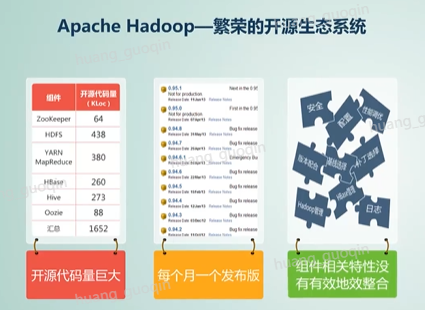 我们知道Apache Hadoop是一个繁荣的开源生态系统,主要特点有Hadoop核心基本组件的开源代码量巨大,将近两百万行。HBase组件在快速的发展中,平均每个月一个发布版各组件。团队之间、团队成员是松耦合的,组件相关的特性也没有有效地整合。