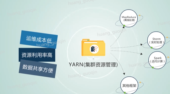 另一个组件实际是Yarn,是hadoop 2.0中的资源管理系统,它是一个通用的资源管理模块,可为各类应用程序进行资源的管理和调度,Yarn是一个轻量级的弹性计算平台。除了MapReduce框架,还可以支持其他框架,比如Spark(迭代计算)、Storm(实时处理),YARN可以对多种框架统一管理,共享集群资源,具有资源的利用率高、运维成本低、数据共享方便等等特点。