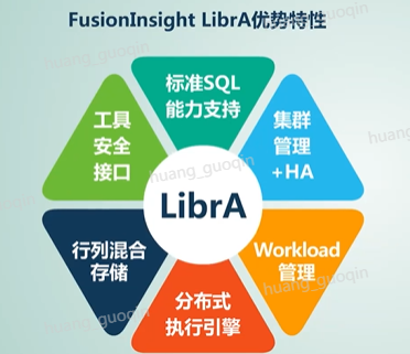 通过架构图我们其实可以发现底层有storage和data node构成了基本的存储部分,通过网络通道提供各个节点的访问,而业务用户则通过coordinator的连接节点来访问数据存储,作为一个并行的数据库集群。LibrA引擎的优势特性主要包含了第一、标准的sql能力支持,它支持标准的sql92和sql2003规范;第二、集群管理加HA高可用;第三、workload的管理;第四、分布式执行引擎;第五、行列混合存储;第六、各种工具、安全保障和api接口。好,这些就是关于Fusionlnsight LibrA的六个优势特征。