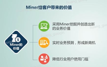 那么Miner带给客户的价值有哪些呢?第一,采用Miner挖掘并创造出新的业务价值;第二,实时业务预测,形成新商机;第三、降低行业用户的使用门槛,使大数据的探索与洞察变得更简单。比如在金融领域,包括金融资产预测、理财产品、精准推荐、客户特征刻画等方面,miner都有其独特的应用价值。