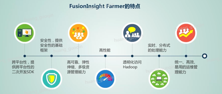 最后我们来认识一下Fusionlnsight farmer,Fusionlnsight farmer是华为的数据服务平台,为企业业务应用提供了轻量级的应用运行环境。其特点主要包括了跨平台性、高可靠性、安全性、高性能、弹性伸缩、实时分布式处理能力、透明化访问hadoop以及统一、高效易用的运维管理能力等等。