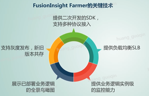 在Fusionlnsight farmer中,关键技术有提供二次开发的sdk,支持socket、web、MQ等多种协议接入。支持基于标准工作流引擎的业务流程编排服务,提供负载均衡SLB,基于Dubbo框架实现去中心化的负载均衡能力,提供业务逻辑实力级的监控能力,自动识别系统短板,根据SLA规则实现业务逻辑的弹性伸缩。通过业务拓扑展示已部署业务逻辑的全景鸟瞰图,支持灰度发布升级时可新旧版本共存,控制并快速的解决新版本可能存在的缺陷,实现平滑升级,保证系统的稳定。