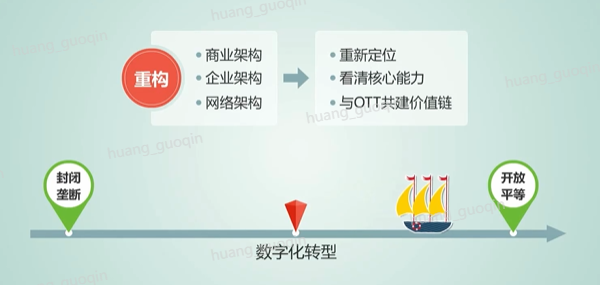 首先我们来看一看移动运营商面临着怎样的问题,而华为又提供了怎样的解决方案呢?从电信的发展历程来看,运营商数字化转型是价值链从封闭、垄断到开放平等过程中的一次被迫重构。数字经济到来以后,运营商必须从商业架构、企业架构和网络架构进行彻底的重构,重新地定位自己,看清自己的核心能力,以开放、合作的心态与OTT共建价值链,才能在这次浪潮中获得成功。