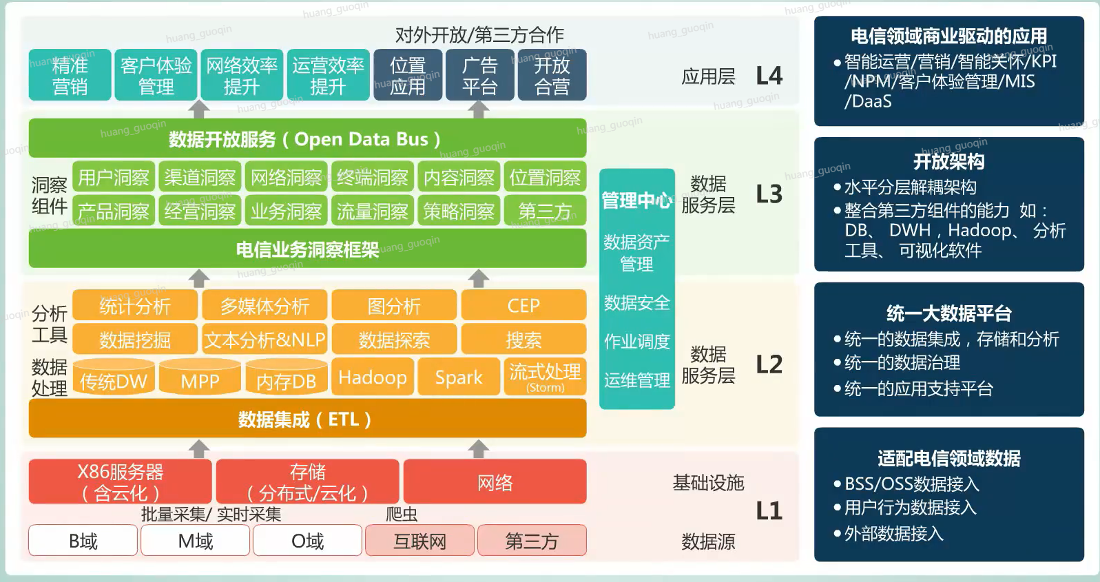 华为大数据解决方案是基于对运营商、用户和网络的理解,综合运营商各域数据进行大数据建模,从而实现用户保留、业务提升、网络效率提升和对外价值变现的最终商业成功。而实际上华为为运营商行业提供的解决方案主要分为四个层次,在level 1基础设施层适配BSS和OSS数据,用户行为数据以及外部数据等电信领域数据。在level 2数据处理层,采用统一的大数据平台,结合level 3服务层,共同组成了FusionInsight平台,向下融合跨域数据,向上支持不同的应用;最后的level 4应用层,主要是电信领域商业驱动的应用。包括了智能运营、营销、智能关怀、KPI、NPM、客户体验管理、MIS、Dass等一些应用。