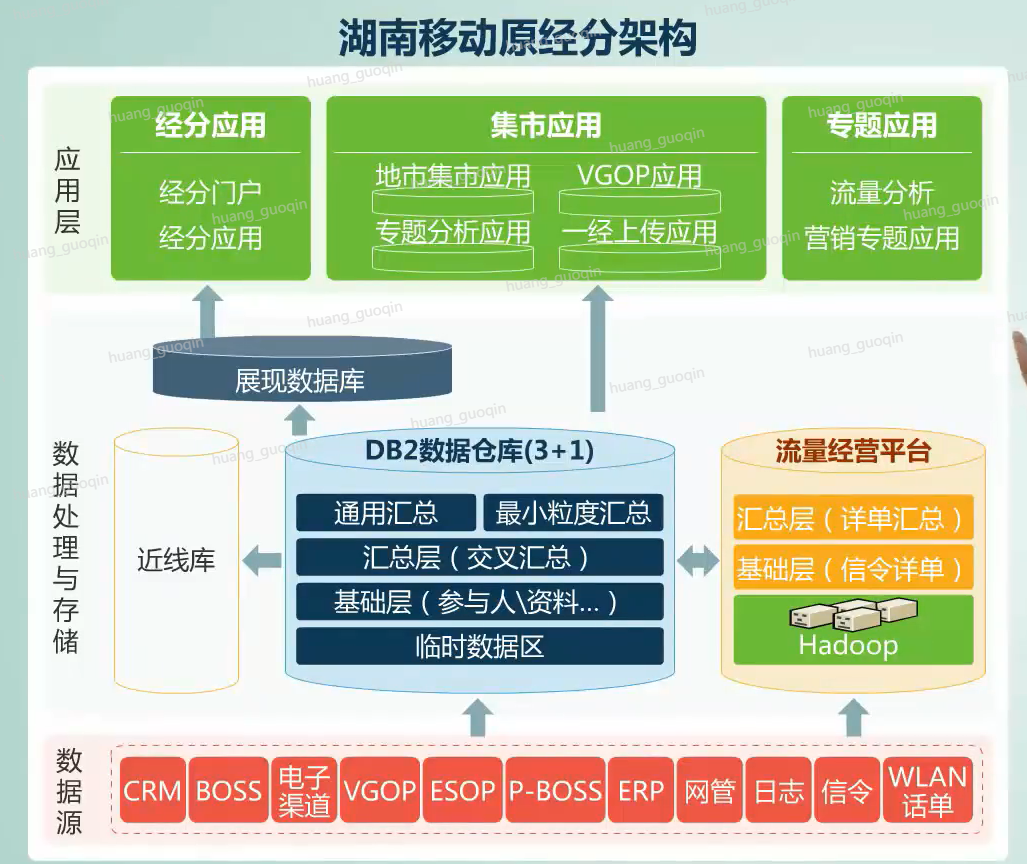 接下来我们来看一个具体的案例,湖南移动原经分架构不能满足业务发展要求,计划采用大数据技术建设新的经分系统。而图中显示的就是原经分系统的架构。我们可以看出原有的经分系统有着非常明显的局限性,主要体现在以下四个方面: