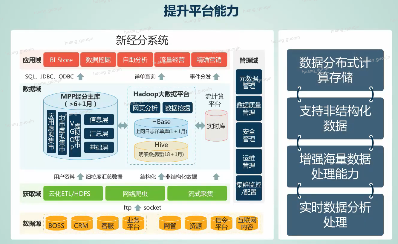 而华为的大数据解决方案凭借技术评比第一、综合评比第一的优势,获得了客户的信赖,从而成功地为湖南移动构建了新的经分系统。华为大数据解决方案主要采用了Hadoop结合LibrA。混搭架构,实现对B\M\O域数据的全面接入,融合处理并进行统一的建模。同时引入爬虫、流计算等技术,实现对互联网数据的处理和实时的业务支撑。而通过本项目的建设,帮助湖南移动实现了如下六个方面的改进和提升:
