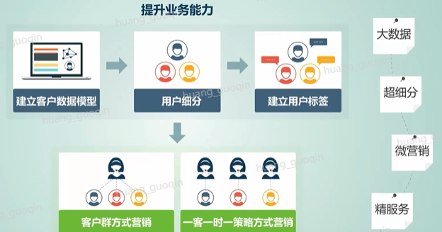 最后,业务能力的提升支撑大数据、超细分、微营销、精服务的落地。比如,建立客户生命周期的模型、客户生物钟模型等数据模型,以用户标签为基础对客户进行细分,建立客户第一时刻、异动时刻、重要时刻、免打扰时刻等标签,分别进行精准的营销,比如以客户群方式营销、以一刻一时一策略的方式进行营销等。