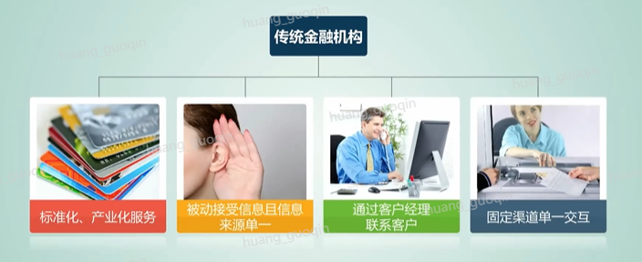 传统金融机构的特征是通过标准化和产业化提供服务,关注过程和步骤,被动接收信息,并且信息的来源单一,通过客户经理联系客户,固定渠道单一交互,可以满足世纪之初的客户需求。那么随着数字化信息时代的发展,客户需求逐步的改变,比如客户需要随时随地的获取服务、寻找有意义的体验以及互动参与内容、产品和体验的创建等等。那么金融机构就需要朝着移动化、个性化、社交化、实时化的方向进行发展。