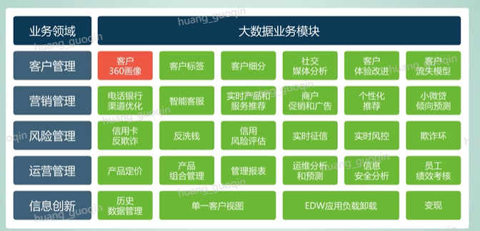 因此全新的金融数据平台架构如图所示,通过构建统一的离线和实时的计算平台,融合跨域数据,从而来支撑不同的业务应用。那么华为金融行业大数据业务主要包括了客户管理、营销管理、风险管理、运营管理以及信息创新五大领域,涵盖客户三百六十度画像、电话银行、信用卡反欺诈、产品定位、历史数据管理等28个业务模块。
