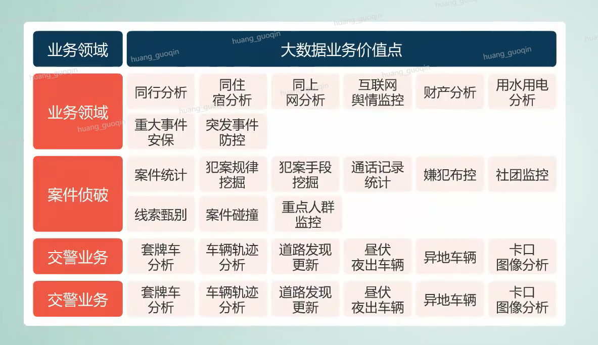 其中公安政府的大数据业务模型主要包括情报分析、案件侦破、交警业务、警员办公四大领域,而大数据的价值点包括了同行分析、案件统计、套牌车分析、电子卷宗检索等29个方面。华为大数据作为一套经过多方检验与实践的成熟的解决方案,能够完美地覆盖公安政府大数据业务。